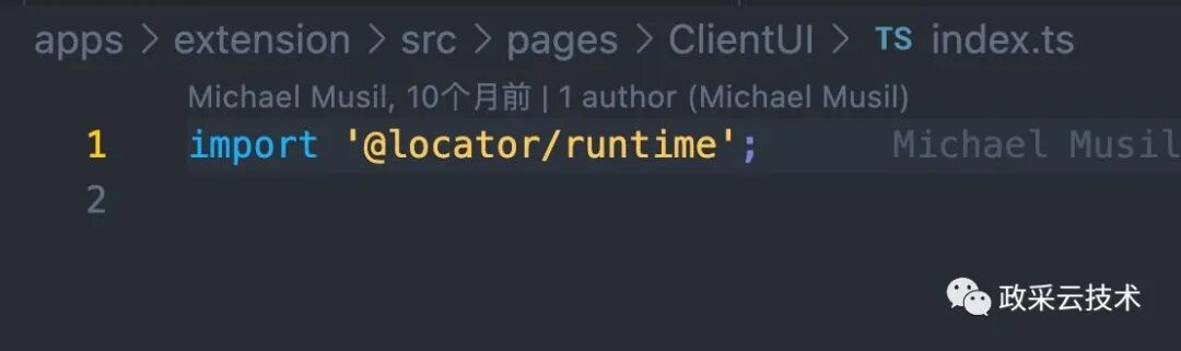 接着我们来看 client.js 到底做了什么。兴致勃勃地打开 ClientUI 文件夹,结果只有一句代码。直接引入了 @locator/runtime,也就是 runtime 代码。