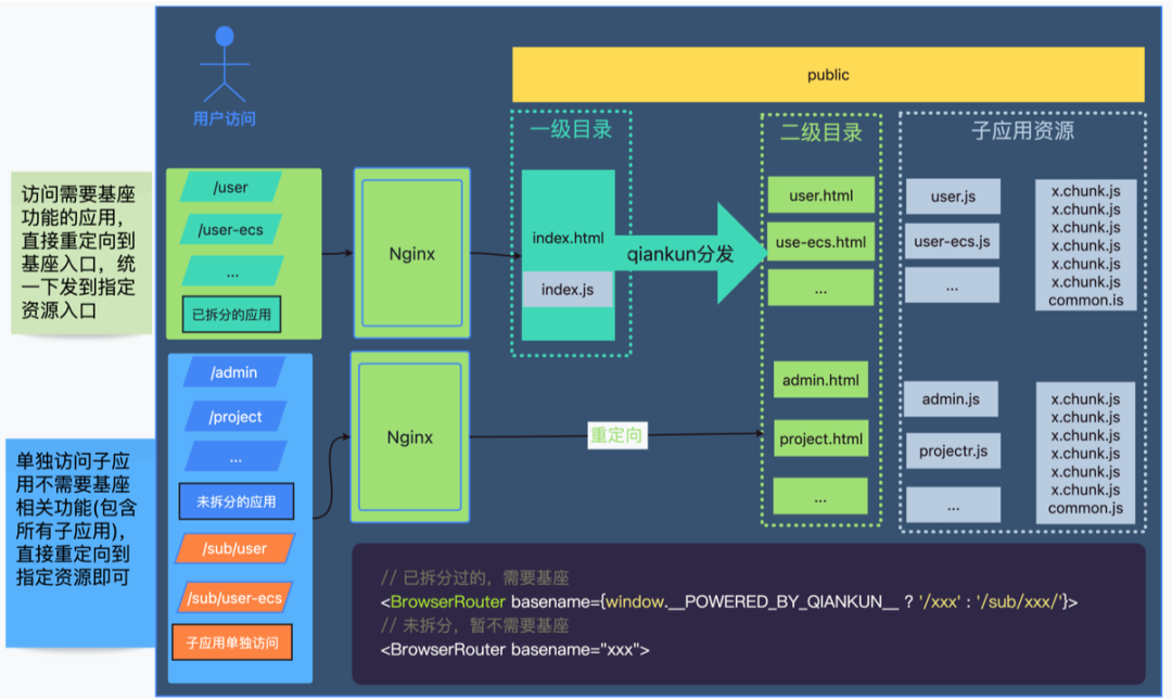 正常的包含基座的访问,由 nginx 统一重定向到基座入口,然后由基座根据访问路径下发到对应子应用。