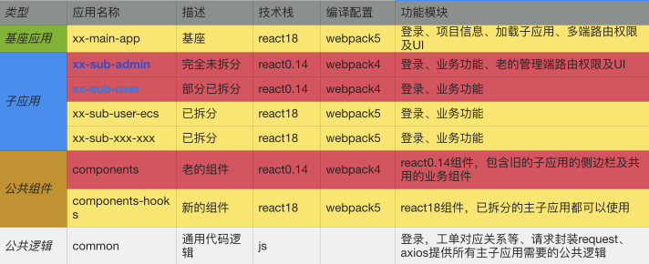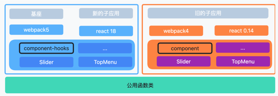 从旧的子应用里拆分出新的子应用和基座的技术栈保持一致,并将新的 webpack 配置和公用组件抽离复用,旧技术栈的子应用使用之前的配置