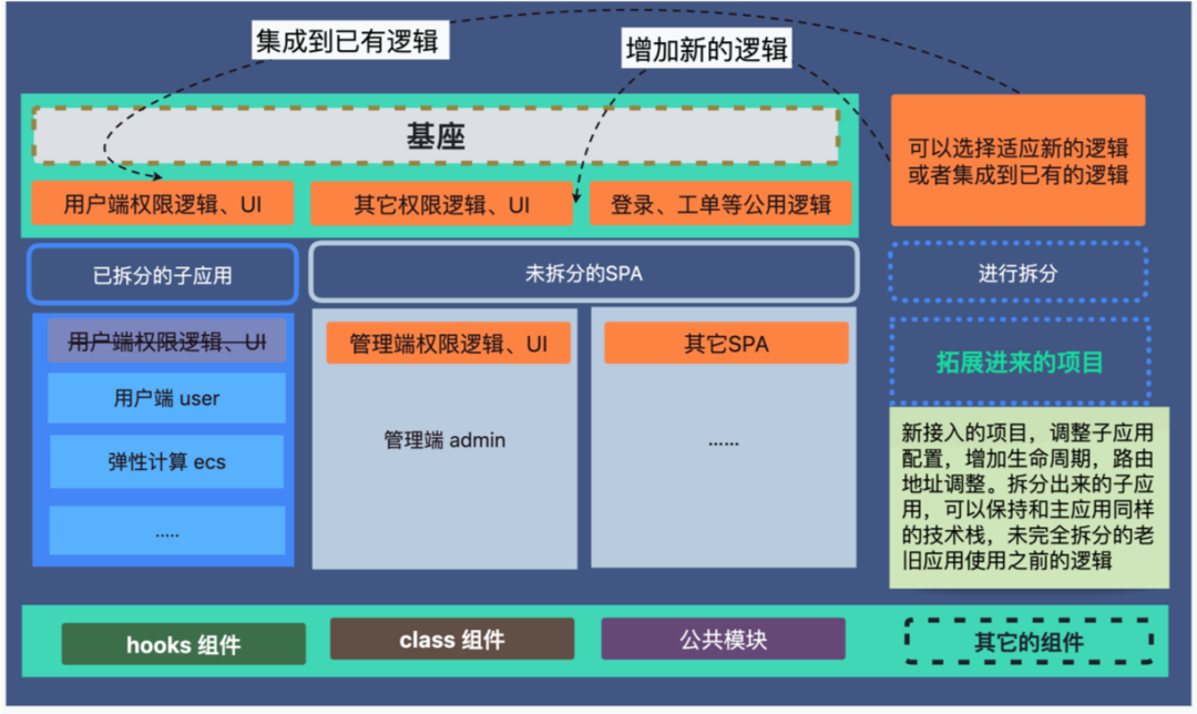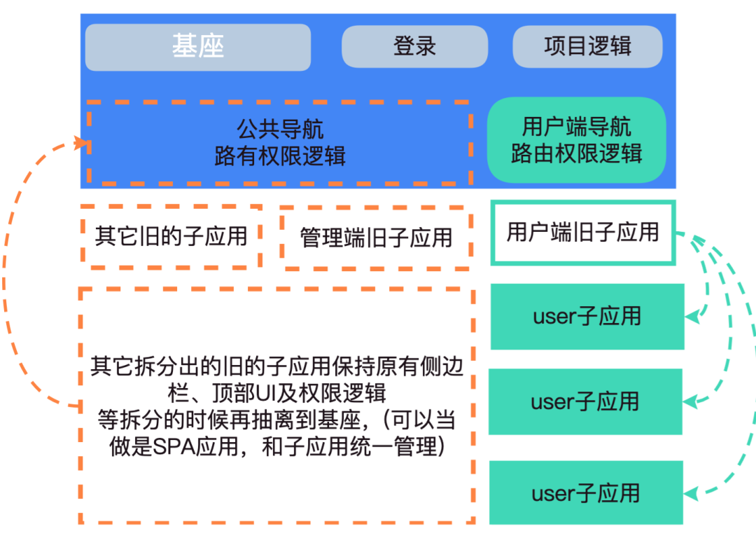 具体做法是将需要拆分的应用,公共部分抽离到基座管理,使用新的子应用替代原来应用里的对应的模块。如图,蓝色部分是包含基座在内的公共模块,绿色是拆分的应用。黄色虚线是暂未拆分的应用,需要的时候再进行抽离拆分。