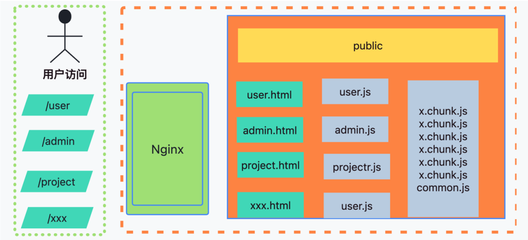 通过 nginx 重定向到对应的 html 入口 然后加载对应 js、chunk 进行渲染