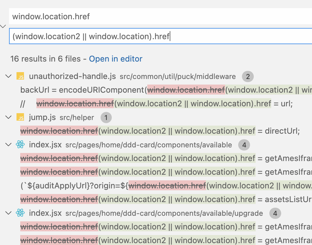 // 由于 location.href 无法重写,只能实现一个 location2.href = ''if (Object.defineProperty) { window.location2 = {}; Object.defineProperty(window.location2, 'href', { get: function() { return location.href; }, set: function(href) { var newHref = beforeRedirect(href); if (newHref) { location.href = newHref; } }, });}因为我们不仅实现了 location.href 的写,location.href 的读也一起实现了,所以可以放心大胆的进行全局替换。找到对应前端工程,首先全局搜索window.location.href,批量替换成(window.location2 || window.location).href,然后再全局搜索location.href,批量替换成(window.location2 || window.location).href(思考一下为什么一定是这个顺序呢)。