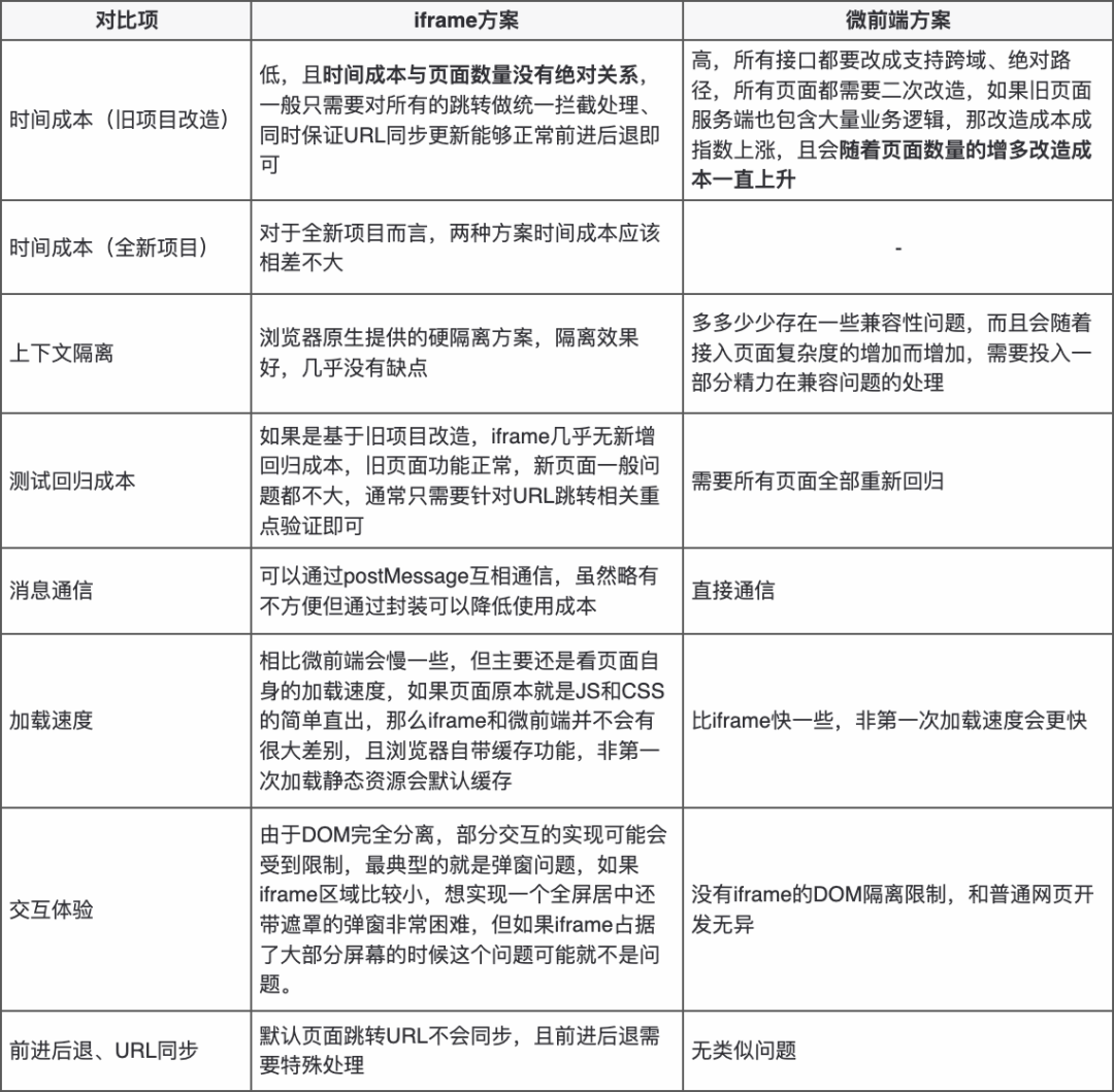 qiankun 的作者有一篇《Why Not Iframe》[1] 介绍了 iframe 的优缺点(不过作者还有一篇《你可能并不需要微前端》[2] 给微前端降降火),诚然 iframe 确实存在很多缺点,但是在选择一个方案的时候还是要具体场景具体分析,它可能在当下很流行,但它不一定在任何时候都是最优解:iframe 的这些缺点对我来说是否能够接受?它的缺点是否有其它方法可以弥补?使用它到底是利大于弊还是弊大于利?我们需要在优缺点之间找到一个平衡。