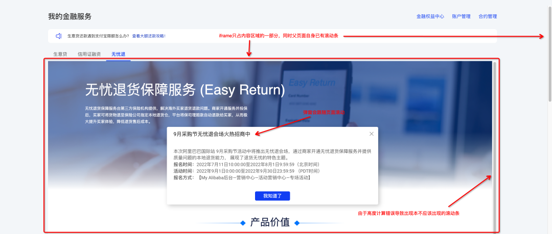 由于 iframe 的一些限制,部分场景并不适合用 iframe,比如像下面这种 iframe 只占据页面中间部分区域,由于父页面已经有一个滚动条了,为了避免出现双滚动条,只能动态计算 iframe 的内容高度赋值给 iframe,使得 iframe 高度完全撑满,但这样带来的问题是弹窗很难处理,如果居中的话一般弹窗都相对的是 iframe 内容高度而不是屏幕高度,从而导致弹窗可能看不见,如果固定弹窗 top 又会导致弹窗跟随页面滚动,而且稍有不慎 iframe 内容高度计算有一点点偏差就会出现双滚动条。