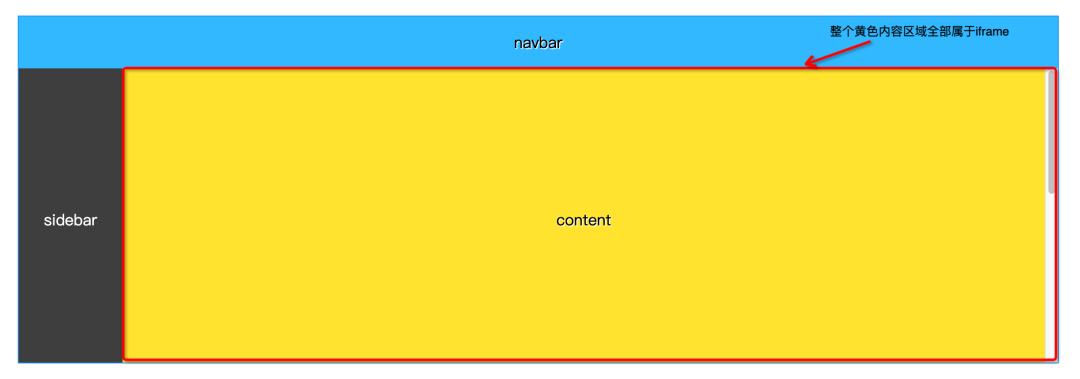 如果页面是包含弹窗、信息提示、或者高度不是固定的话,需要看 iframe 是否占据了全部的内容区域,如果是像下图这种经典的导航 + 菜单 + 内容结构、并且整个内容区域都是 iframe,那么可以放心大胆地尝试 iframe,否则,需要慎重考虑方案选型。