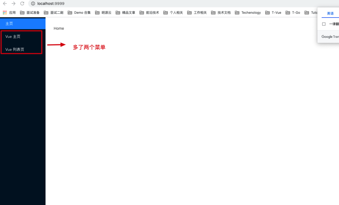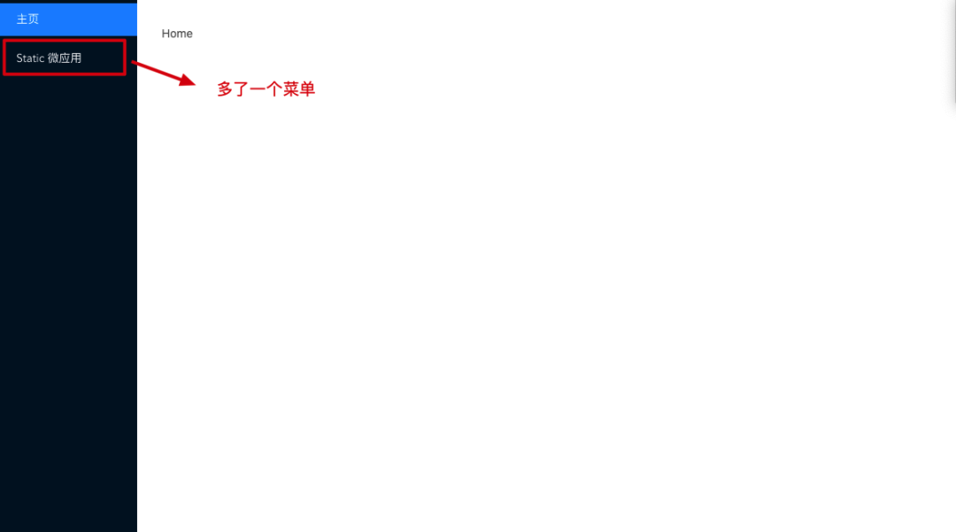 // micro-app-main/src/App.vue//...export default class App extends Vue { /** * 菜单列表 * key: 唯一 Key 值 * title: 菜单标题 * path: 菜单对应的路径 */ menus = [ { key: "Home", title: "主页", path: "/" }, { key: "StaticMicroApp", title: "Static 微应用", path: "/static" } ];}菜单配置完成后,我们的主应用基座效果图如下