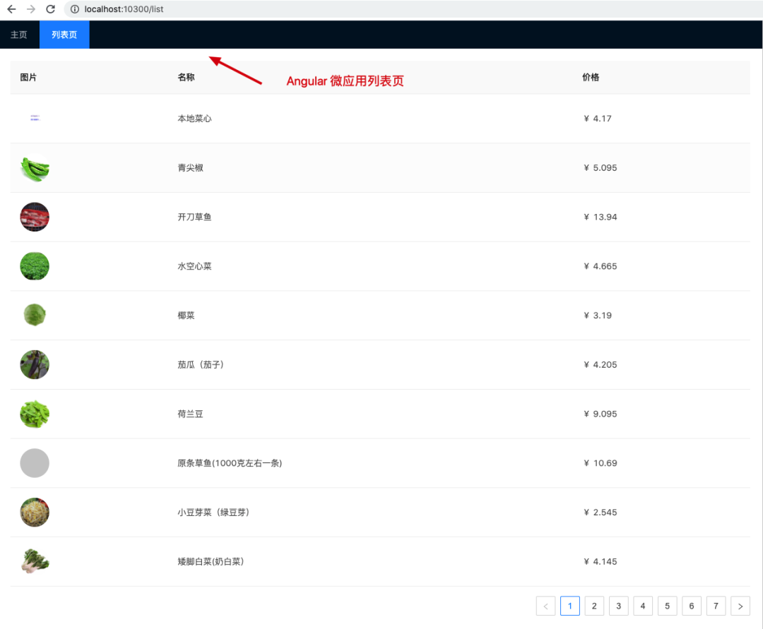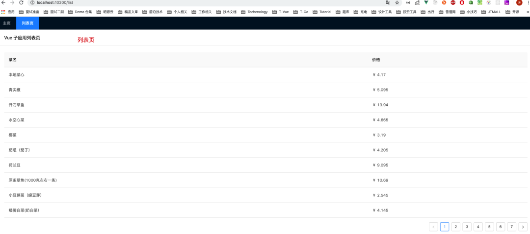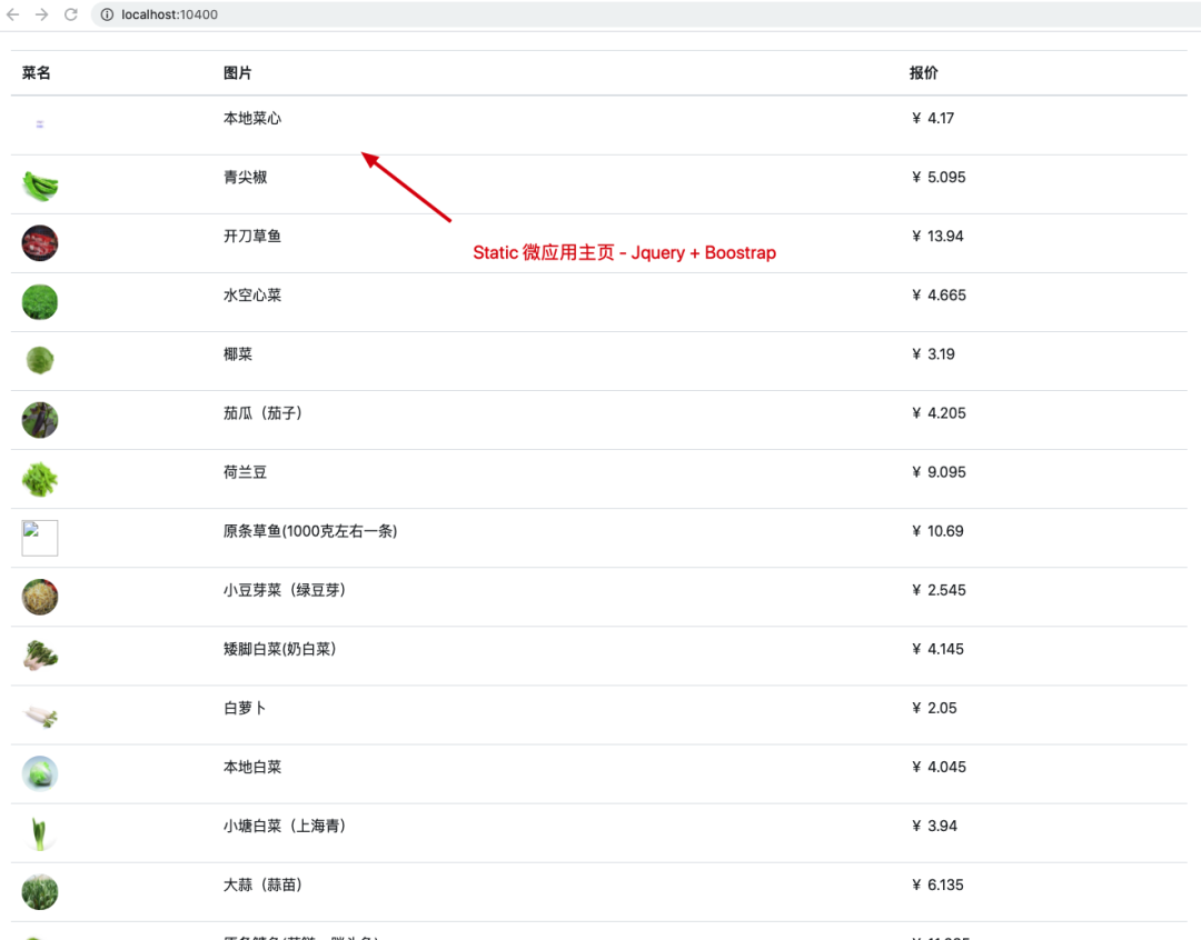 <!-- micro-app-static/static/index.html --><!DOCTYPE html><html lang="en"> <head> <meta charset="UTF-8" /> <meta /> <!-- 引入 bootstrap --> <link href="https://cdn.bootcdn.net/ajax/libs/twitter-bootstrap/4.4.1/css/bootstrap.min.css" rel="stylesheet" /> <title>Jquery App</title> </head> <body> <section id="jquery-app-container" style="padding: 20px; color: blue;" ></section> </body> <!-- 引入 jquery --> <script src="https://cdn.bootcdn.net/ajax/libs/jquery/3.5.1/jquery.min.js"></script> <script> /** * 请求接口数据,构建 HTML */ async function buildHTML() { const result = await fetch("http://dev-api.jt-gmall.com/mall", { method: "POST", headers: { "Content-Type": "application/json", }, // graphql 的查询风格 body: JSON.stringify({ query: `{ vegetableList (page: 1, pageSize: 20) { page, pageSize, total, items { _id, name, poster, price } } }`, }), }).then((res) => res.json()); const list = result.data.vegetableList.items; const html = `<table class="table"> <thead> <tr> <th scope="col">菜名</th> <th scope="col">图片</th> <th scope="col">报价</th> </tr> </thead> <tbody> ${list .map( (item) => ` <tr> <td> <img style="width: 40px; height: 40px; border-radius: 100%;" src="${item.poster}"></img> </td> <td>${item.name}</td> <td>¥ ${item.price}</td> </tr> ` ) .join("")} </tbody></table>`; return html; } /** * 渲染函数 * 两种情况:主应用生命周期钩子中运行 / 微应用单独启动时运行 */ const render = async ($) => { const html = await buildHTML(); $("#jquery-app-container").html(html); return Promise.resolve(); }; // 独立运行时,直接挂载应用 if (!window.__POWERED_BY_QIANKUN__) { render($); } ((global) => { /** * 注册微应用生命周期钩子函数 * global[appName] 中的 appName 与主应用中注册的微应用名称一致 */ global["StaticMicroApp"] = { /** * bootstrap 只会在微应用初始化的时候调用一次,下次微应用重新进入时会直接调用 mount 钩子,不会再重复触发 bootstrap。 * 通常我们可以在这里做一些全局变量的初始化,比如不会在 unmount 阶段被销毁的应用级别的缓存等。 */ bootstrap: () => { console.log("MicroJqueryApp bootstraped"); return Promise.resolve(); }, /** * 应用每次进入都会调用 mount 方法,通常我们在这里触发应用的渲染方法 */ mount: () => { console.log("MicroJqueryApp mount"); return render($); }, /** * 应用每次 切出/卸载 会调用的方法,通常在这里我们会卸载微应用的应用实例 */ unmount: () => { console.log("MicroJqueryApp unmount"); return Promise.resolve(); }, }; })(window); </script></html>在构建好了 Static 微应用后,我们打开主应用基座 http://localhost:9999。我们点击左侧菜单切换到微应用,此时可以看到,我们的 Static 微应用被正确加载啦!(见下图)