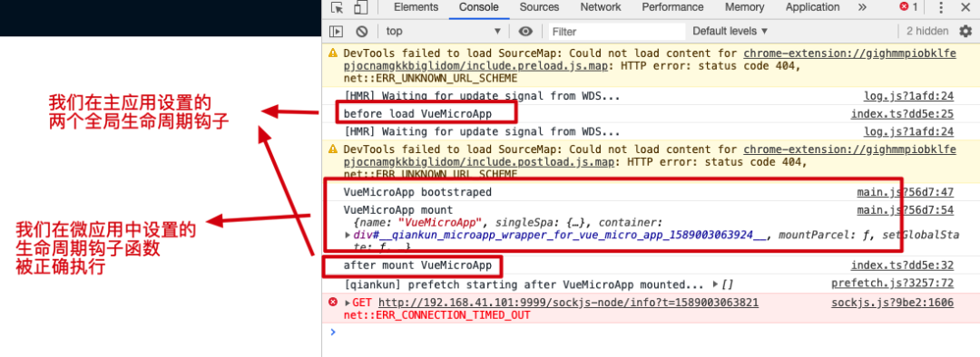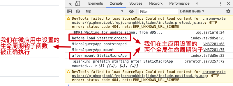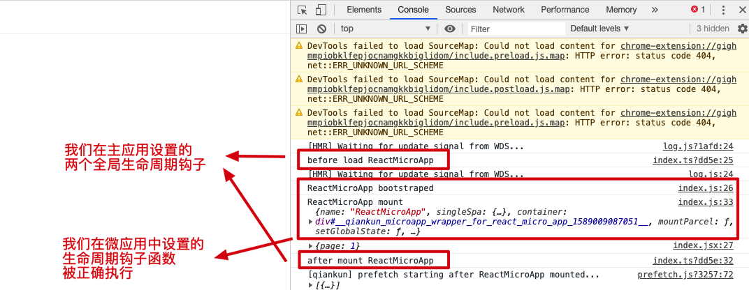 从上图可以看出,qiankun 内部会校验微应用的生命周期钩子函数,如果微应用没有导出这三个生命周期钩子函数,则微应用会加载失败。