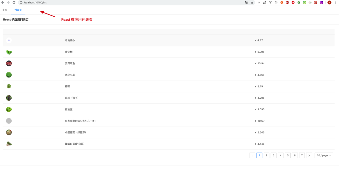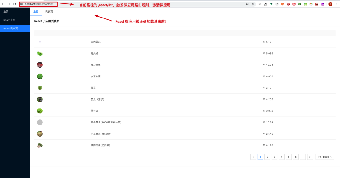 在 config-overrides.js 修改完成后,我们重新启动 React 微应用,然后打开主应用基座 http://localhost:9999。我们点击左侧菜单切换到微应用,此时我们的 React 微应用被正确加载啦!(见下图)