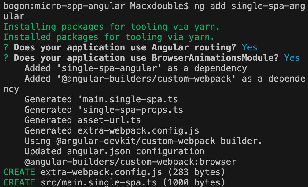 # 安装 single-spayarn add single-spa -S# 添加 single-spa-angularng add single-spa-angular运行命令时,根据自己的需求选择配置即可,本文配置如下: