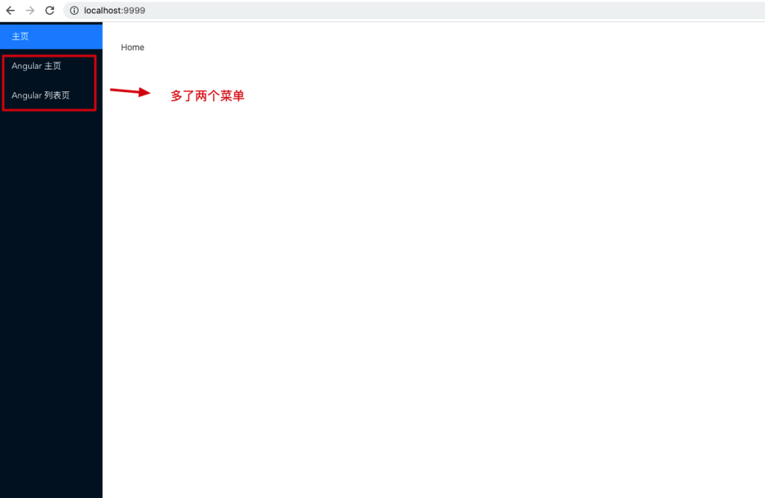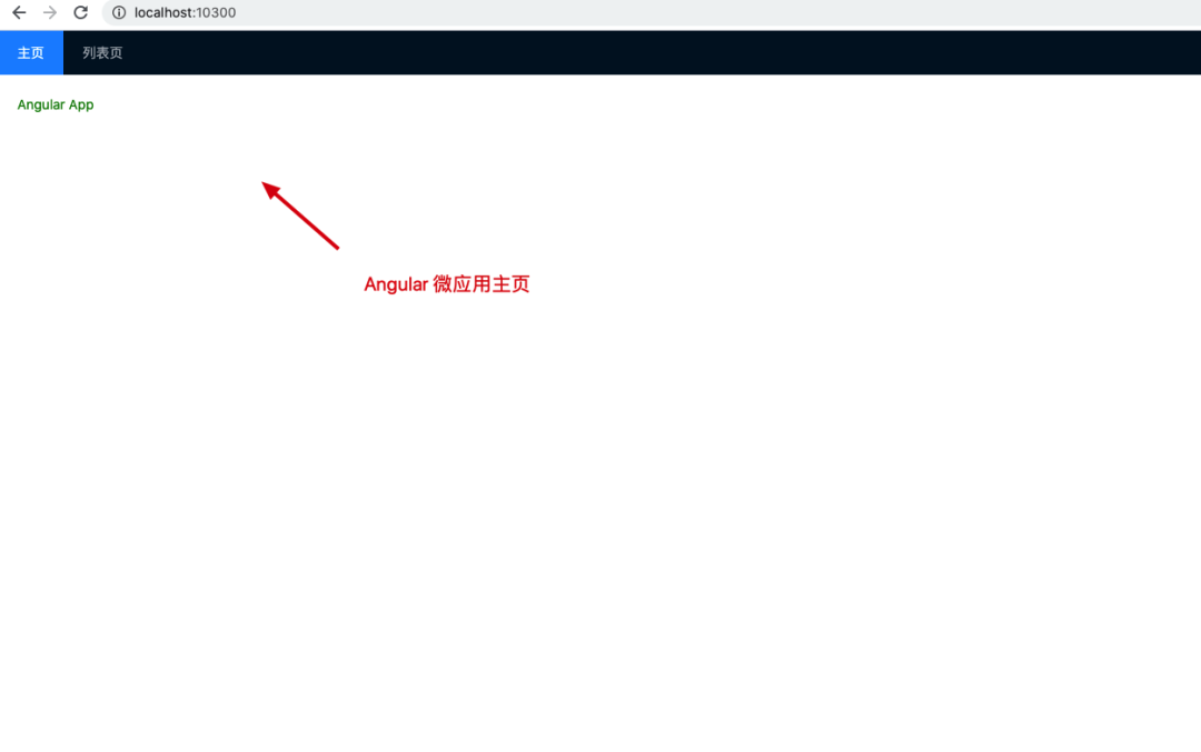 // micro-app-main/src/App.vue//...export default class App extends Vue { /** * 菜单列表 * key: 唯一 Key 值 * title: 菜单标题 * path: 菜单对应的路径 */ menus = [ { key: "Home", title: "主页", path: "/", }, { key: "AngularMicroApp", title: "Angular 主页", path: "/angular", }, { key: "AngularMicroAppList", title: "Angular 列表页", path: "/angular/list", }, ];}菜单配置完成后,我们的主应用基座效果图如下