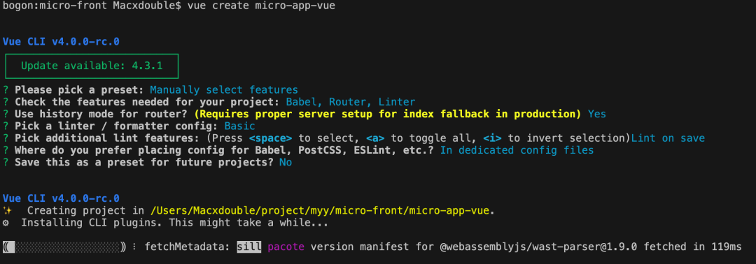 vue create micro-app-vue<br style="max-width: 100%;box-sizing: border-box !important;overflow-wrap: break-word !important;">本文的 vue-cli 选项如下图所示,你也可以根据自己的喜好选择配置。