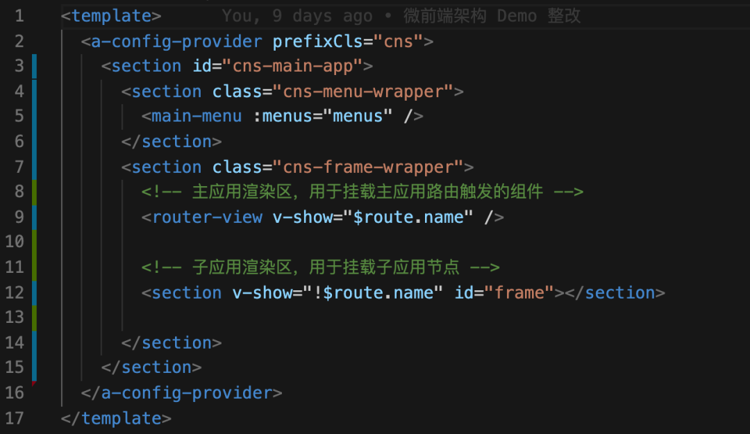 第 5 行:主应用菜单,用于渲染菜单;第 9 行:主应用渲染区。在触发主应用路由规则时(由路由配置表的$route.name判断),将渲染主应用的组件;第 10 行:微应用渲染区。在未触发主应用路由规则时(由路由配置表的$route.name判断),将渲染微应用节点;