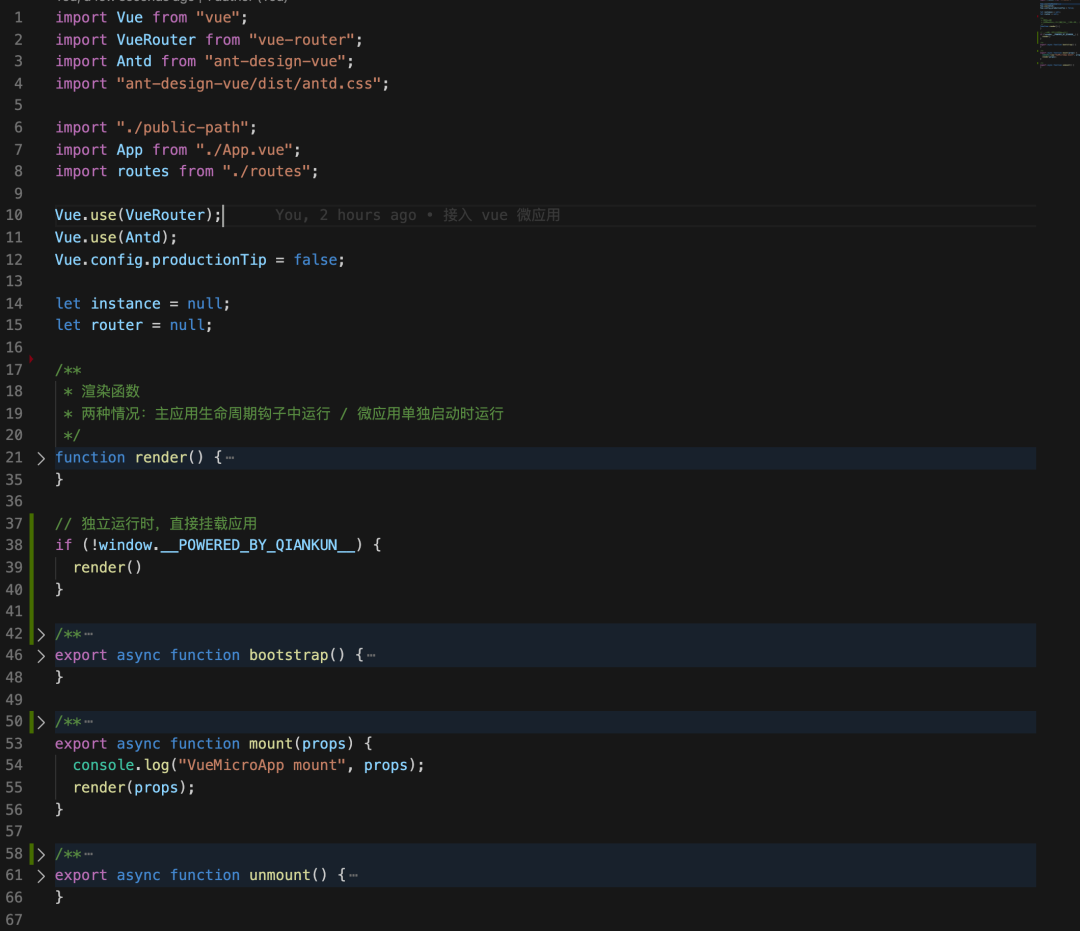 在主应用注册好了微应用后,我们还需要对微应用进行一系列的配置。首先,我们在 Vue 的入口文件 main.js 中,导出 qiankun 主应用所需要的三个生命周期钩子函数,代码实现如下: