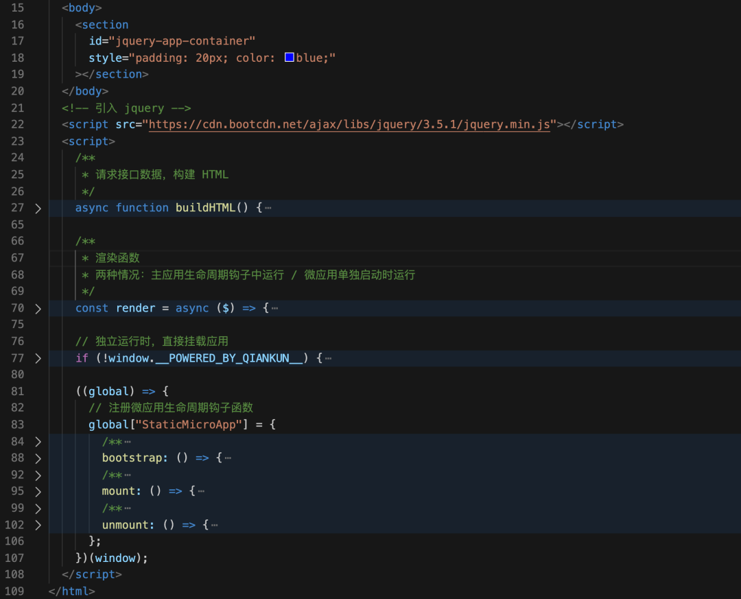 在主应用注册好了微应用后,我们还需要直接写微应用 index.html 的代码即可,代码实现如下: