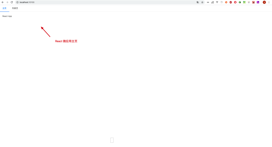 // micro-app-main/src/App.vue//...export default class App extends Vue { /** * 菜单列表 * key: 唯一 Key 值 * title: 菜单标题 * path: 菜单对应的路径 */ menus = [ { key: "Home", title: "主页", path: "/", }, { key: "ReactMicroApp", title: "React 主页", path: "/react", }, { key: "ReactMicroAppList", title: "React 列表页", path: "/react/list", }, ];}菜单配置完成后,我们的主应用基座效果图如下
