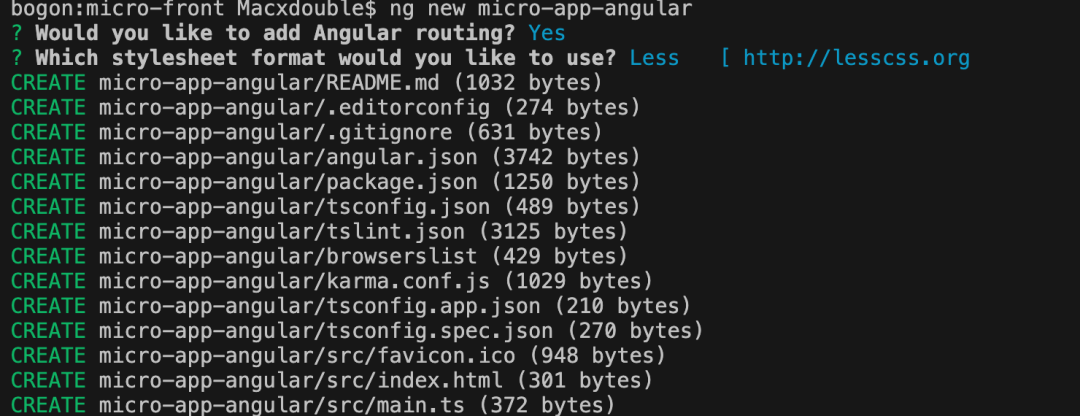 在主应用的工作完成后,我们还需要对微应用进行一系列的配置。首先,我们使用 single-spa-angular 生成一套配置,在命令行运行以下命令: