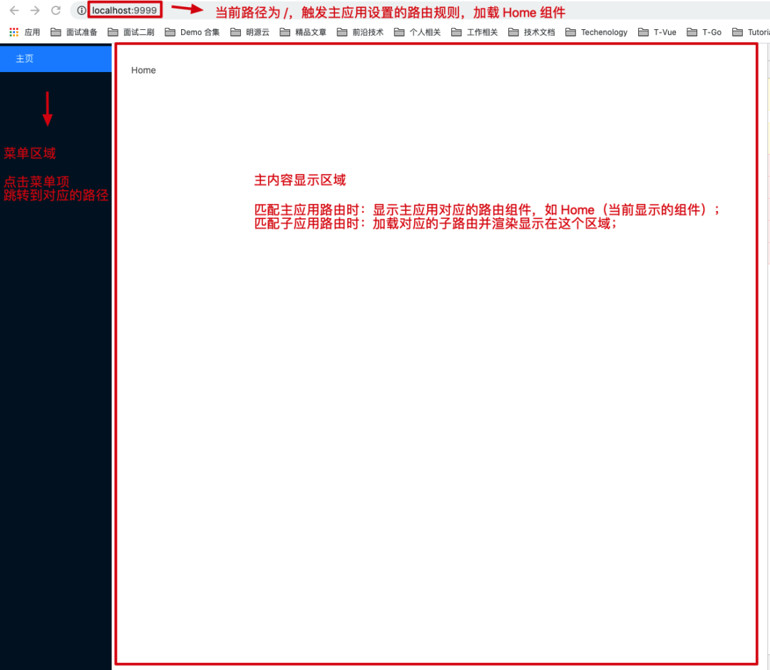 // micro-app-main/src/App.vue//...export default class App extends Vue { /** * 菜单列表 * key: 唯一 Key 值 * title: 菜单标题 * path: 菜单对应的路径 */ menus = [ { key: "Home", title: "主页", path: "/", }, ];}上面的代码是我们对菜单配置的实现,我们还需要实现基座和微应用的显示区域(如下图)
