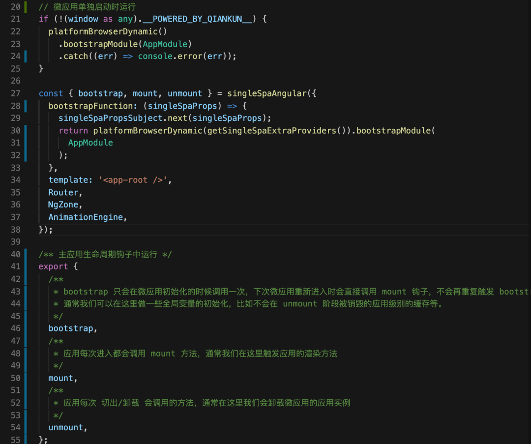 在生成 single-spa 配置后,我们需要进行一些 qiankun 的接入配置。我们在 Angular微应用的入口文件 main.single-spa.ts 中,导出 qiankun 主应用所需要的三个生命周期钩子函数,代码实现如下: