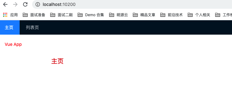 // micro-app-main/src/App.vue//...export default class App extends Vue { /** * 菜单列表 * key: 唯一 Key 值 * title: 菜单标题 * path: 菜单对应的路径 */ menus = [ { key: "Home", title: "主页", path: "/", }, { key: "VueMicroApp", title: "Vue 主页", path: "/vue", }, { key: "VueMicroAppList", title: "Vue 列表页", path: "/vue/list", }, ];}菜单配置完成后,我们的主应用基座效果图如下