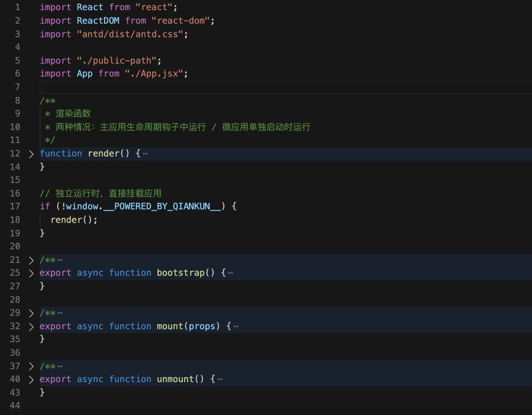 在主应用注册好了微应用后,我们还需要对微应用进行一系列的配置。首先,我们在 React的入口文件 index.js 中,导出 qiankun 主应用所需要的三个生命周期钩子函数,代码实现如下: