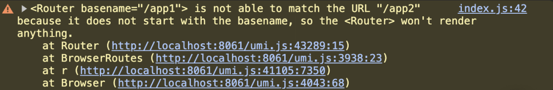 export function Router({ // ...}: RouterProps): React.ReactElement | null {let locationContext = React.useMemo(() => { // pathname 和 basename 不匹配时返回 null let trailingPathname = stripBasename(pathname, basename); if (trailingPathname == null) { returnnull; } }, [basename, pathname, search, hash, state, key, navigationType]); warning( locationContext != null, `<Router basename="${basename}"> is not able to match the URL ` + `"${pathname}${search}${hash}" because it does not start with the ` + `basename, so the <Router> won't render anything.` );if (locationContext == null) { returnnull; }return ( <NavigationContext.Provider value={navigationContext}> <LocationContext.Provider children={children} value={locationContext} /> </NavigationContext.Provider> );}具体原因:非激活子应用(basename=/app1)收到了不属于它的路由变化通知(pathname=/app2/xxx),导致匹配失败。