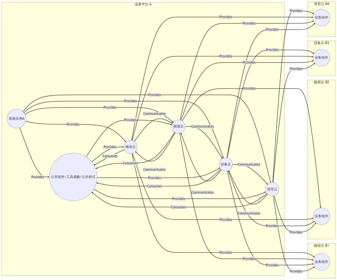 正如上面所说,我们需要 webpack5 的模块联邦功能,将公共组件,函数,样式,package 包等共享出来,供其他应用使用。大体结构图如下:在上述流程图中,展示了一个微前端架构应用的结构和关系。基座应用 A 作为主应用(业务中台),提供公共组件、工具函数、公共样式(表示为 "C")给其他所有子应用(物业云、能源云、设备云、资管云)。某些子应用也会提供业务组件(表示为 "D1"、"D2"、"D3"、"D4")给其他子应用使用。某些应用之间存在通讯关系(如 B1 和 B2 之间、B2 和 B3 之间),但不能直接兄弟应用间通讯,而是先通讯给父组件(业务中台),再由业务中台发送事件给对应的子应用。