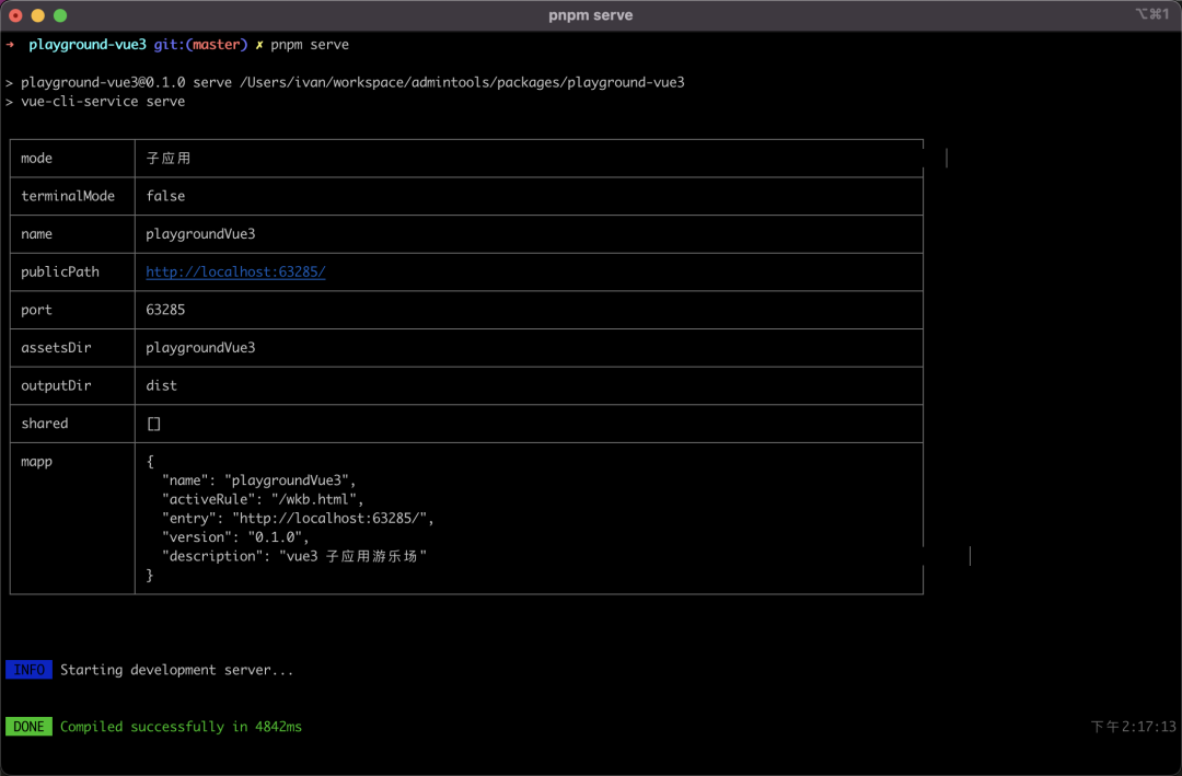 运行起来后, 我们会在终端打印出子应用的相关信息,如下图: