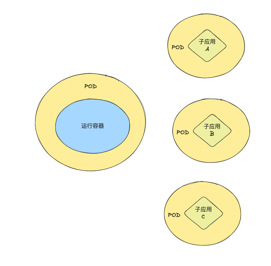 每个子应用都是独立的 Pod。好处就是每个子应用可以真正做到独立部署、启动,坏处就是管理起来稍显麻烦。