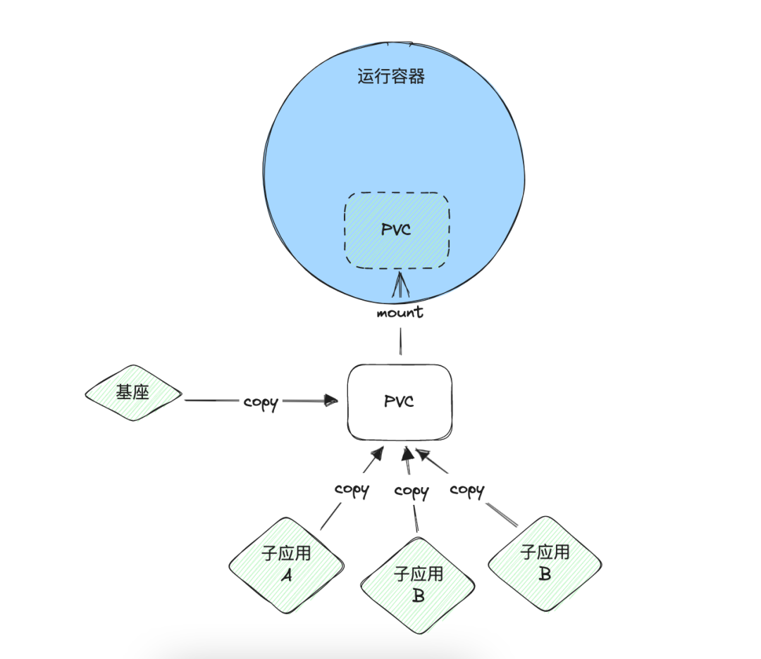 将基座和子应用聚合在一起,我们需要用到 PVC (PersistentVolumeClaim, 即持久化卷), 你可以认为 PVC 就是一个「网络硬盘」,而每个子应用、基座都是独立运行的「主机」(Pod 或 容器 , Kubernetes 中可部署的最小、最基本对象), 这个 PVC 可以被每个子应用共享访问,只要按照约定将子应用的静态文件拷贝到 PVC 对应位置就行了。如下图所示:
