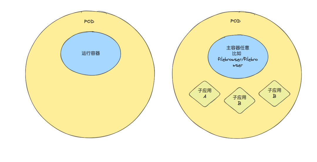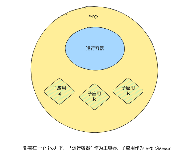 分离运行容器和子应用。为了避免子应用更新导致整个 Pod 重启(包括运行容器),我们可以将子应用单独拎出去,子应用更新只会重启所在的 Pod,从而避免运行容器停机。