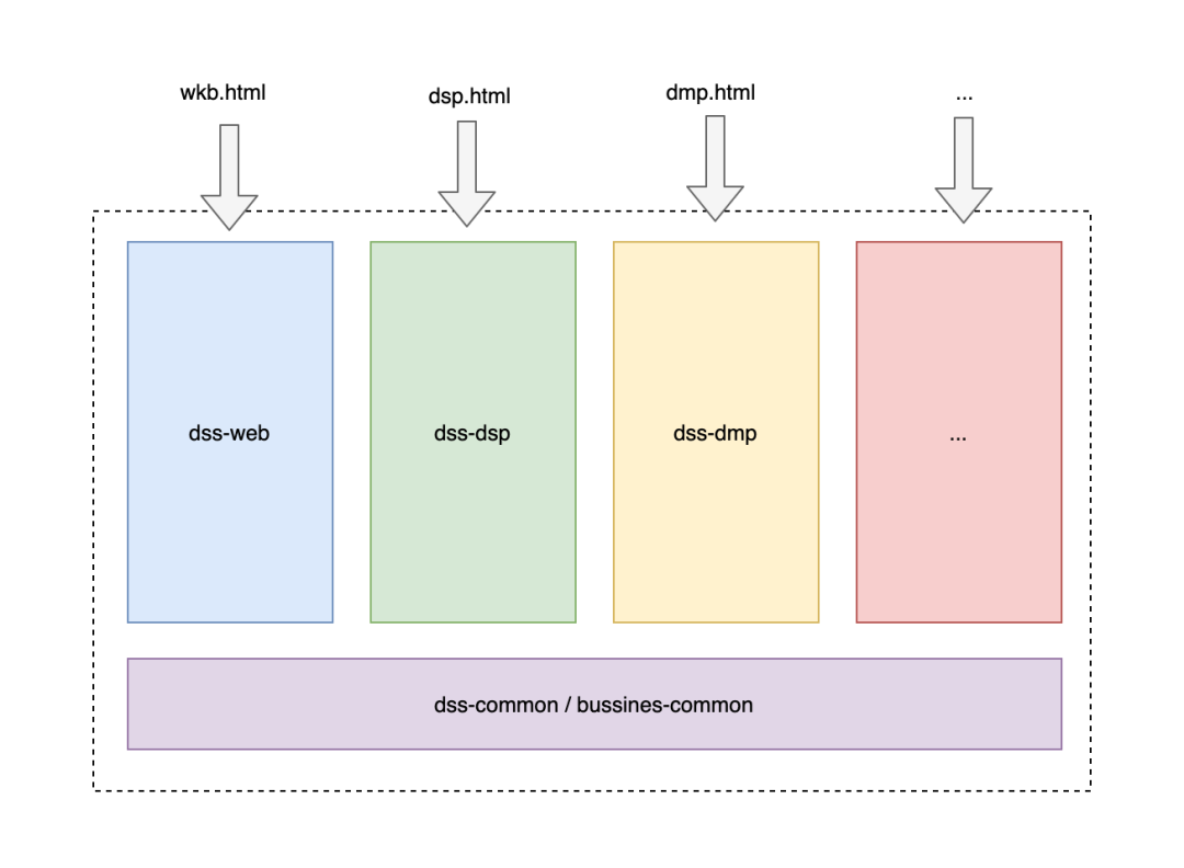 在改造成微前端之前, 我们也是一个巨型的单体应用,后面随着业务的复杂化,业务和团队进一步进行拆分, 我们的前端项目也根据康威定律,进化成为了‘多页应用’, 如下图所示: