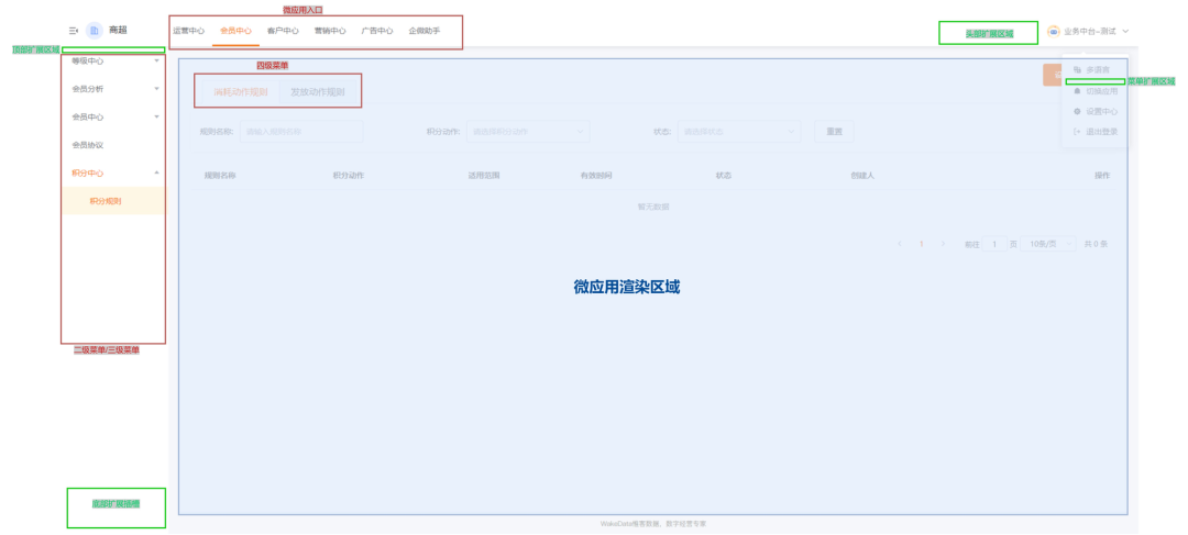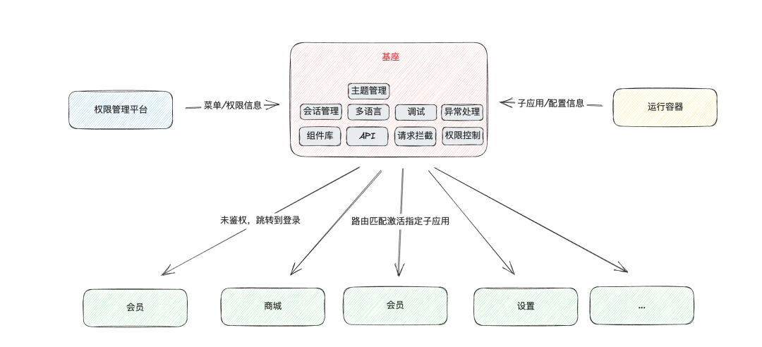 权限管理平台, 通过权限管理平台可以灵活地给不同业态、不同角色配置不同的菜单和权限。这是我们微前端方案的重要基础。基座: 基座是微前端应用集成的一个重要平台。同时也肩负着管理公共资源、依赖、规范的责任。主要有以下职责: