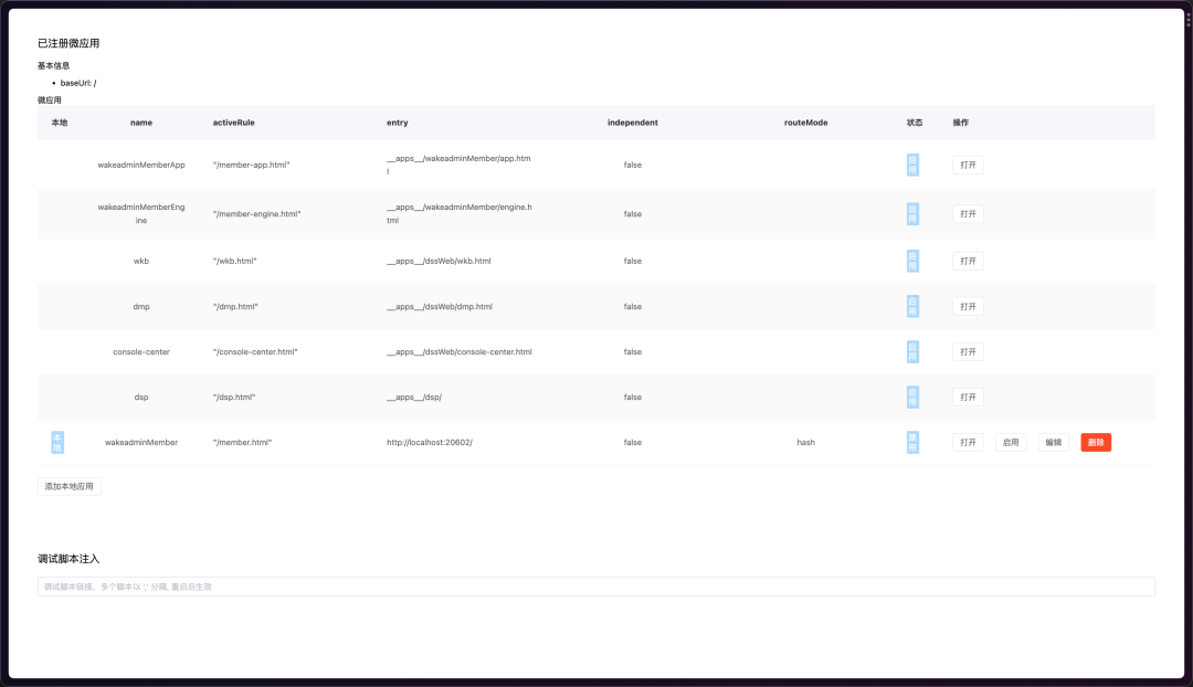 接下来,只需要在基座的调试页面,注册这个子应用就可以运行起来的: