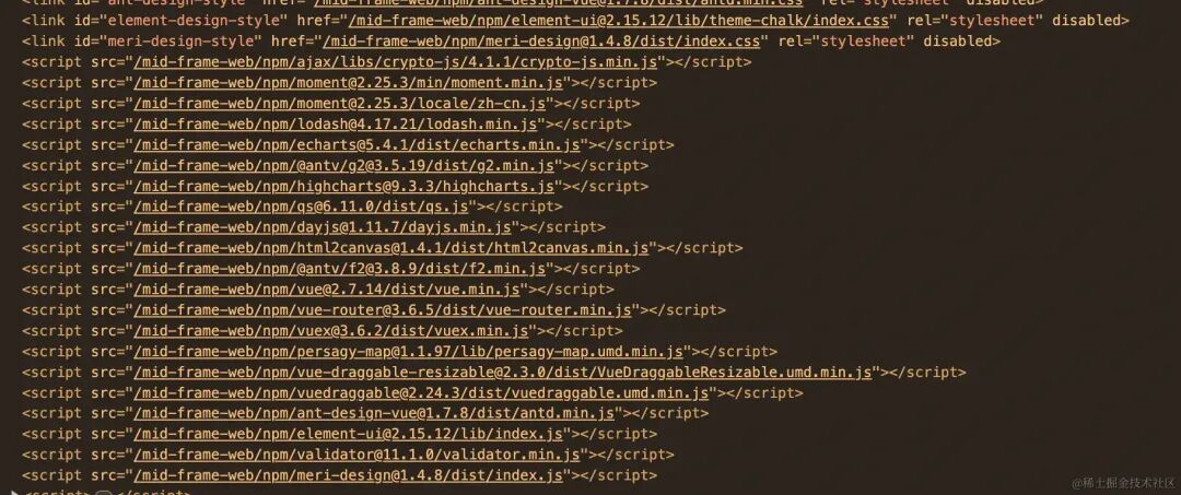 import { createHtmlPlugin } from 'vite-plugin-html';const packageName = edgeClient ? 'meos-autocontrol-web-edge' : 'meos-control-web';export default defineConfig(({ mode }) => { const plugins = [ // ...其他插件 createHtmlPlugin({ minify: true, inject: { data: { title: packageName, cdnList: cdnList } } }), // ...其他插件 ]; return { // ...其他配置 plugins, // ...其他配置 };});- 在 index.html 中使用模板语法将 cdnList 渲染到 HTML 中