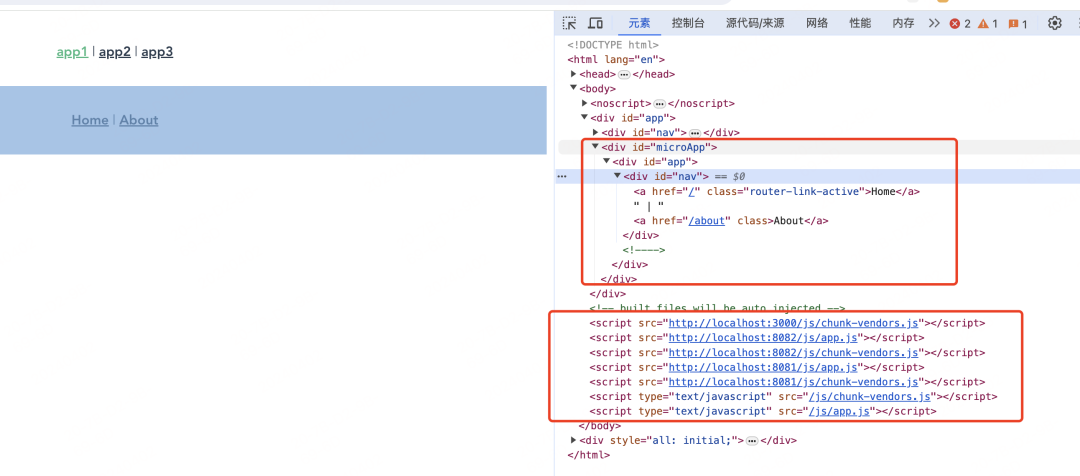 可以看到它是动态加载的子应用的 js,并执行 js,将内容渲染到了主应用的盒子内。