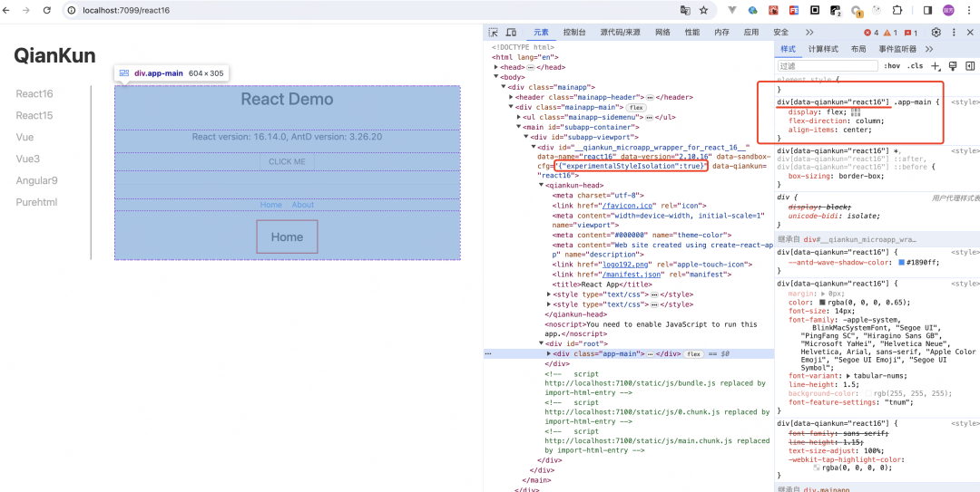 {experimentalStyleIsolation: true}被设置,qiankun 会改写子应用所添加的样式为所有样式规则增加一个特殊的选择器规则来限定其影响范围。