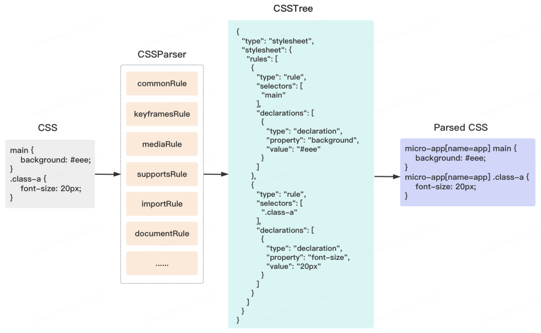 默认使用正则将 CSS 字符串切割成最小单元,每个单元包含一段 CSS 信息,将所有的信息整理生成 CSSTree,遍历 CSSTree 的每个规则,添加前缀实现样式隔离。