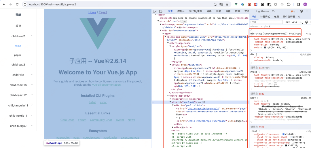 const package = require('./package.json')module.exports = { // 告诉子应用在这个地址加载静态资源,否则会去基座应用的域名下加载 publicPath: '//localhost:8082', // 开发服务器 devServer: { port: 8082 }, configureWebpack: { // 导出umd格式的包,在全局对象上挂载属性package.name,基座应用需要通过这个全局对象获取一些信息,比如子应用导出的生命周期函数 output: { // library的值在所有子应用中需要唯一 library: package.name, libraryTarget: 'umd' } }}4. 预览
