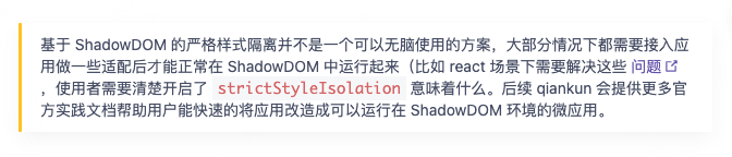 其原理是 shadow dom, 可以有效对样式进行隔离,但在 react 场景下,开启后会导致事件失效,所有的事件回调无法执行,严重影响系统功能;这一点在 qiankun 官方文档中亦有提及。