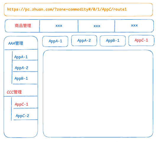 #/0/1/AppC/route1,表示第 0 个顶部菜单下第 1 个父菜单下的 / AppC/route1 菜单,这里的 AppC-1 的路由就是 / AppC/route1,其中 route1 是 AppC 定义在项目中的路由,AppC 表明是哪个应用。