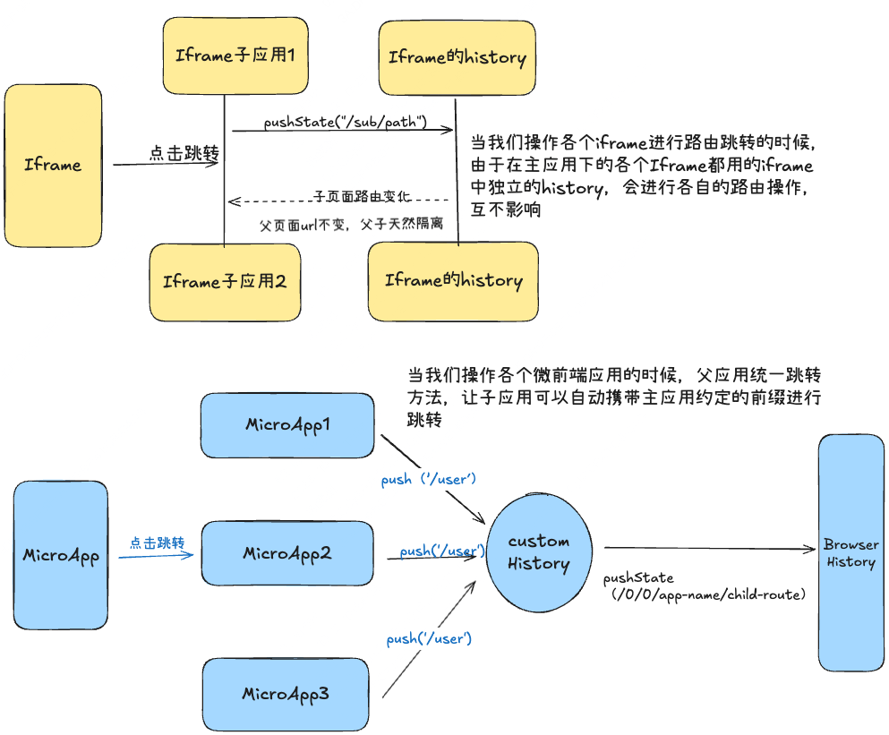 在 Iframe 模式下,内嵌页面拥有 “浏览器级” 的完整上下文,直接调用 history.pushState/replaceState 或框架层的 router.push/router.replace 就能独立驱动地址栏变化,每个 Iframe 的 URL 与父页面天然隔离,彼此互不干扰。