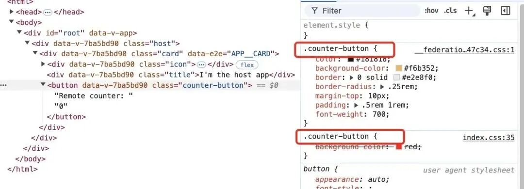 在remote定义的 counter 组件有使用样式counter-button,假如host也同样定义了同名的 class counter-button,并设置background-color: #F00。运行结果是远端的样式将本地的样式覆盖,也就是说本地的样式被远端样式给污染了,这不是我们想要的结果。