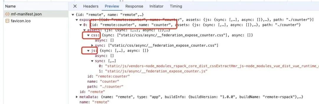 module federation 2.0其中的一个特性就是引入minifest元数据信息,这里返回的正是使用pluginModuleFederation定义的 remote 信息。先着重看exposes列表,每一项即为我们在配置中定义的导出模块,例如 ./counter对应的就是返回信息中id为remote:counter一项 ,其中 assets 下包含css、js属性。