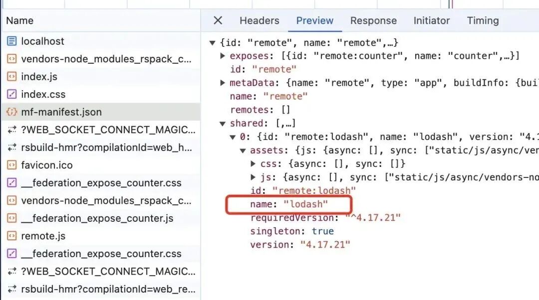 remote、host都在使用 loadash,并且 lodash 包体积比较大。那么可以将其配置到shared选项,在两个项目的rsbuild.config.ts同时添加:shared: { lodash: { singleton: true, eager: true, } }重新请求