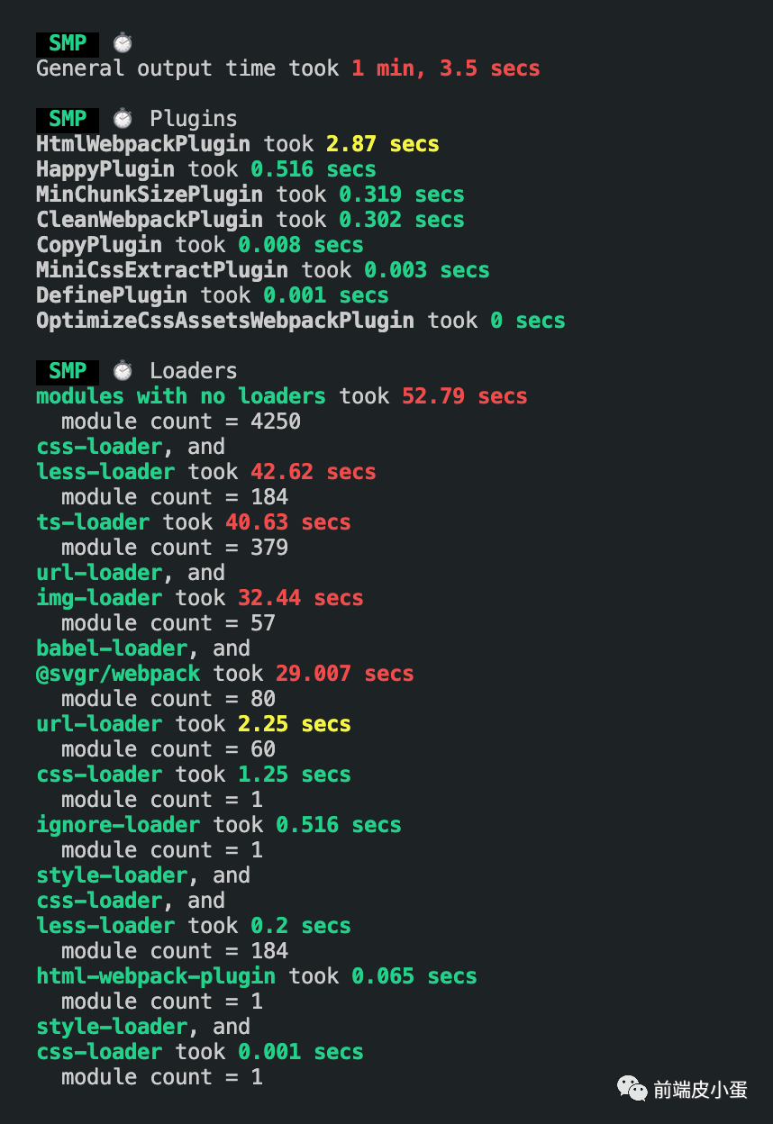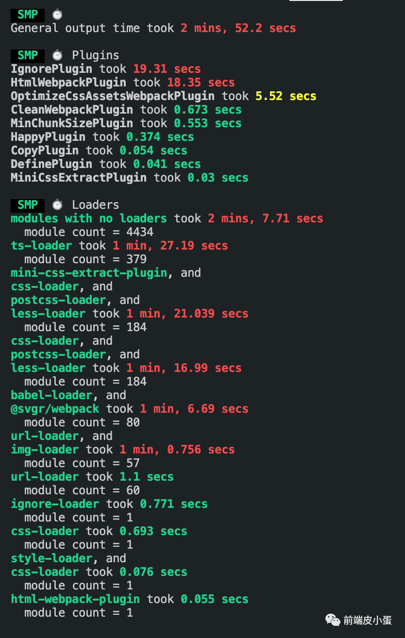 // webpack.config.jsconst SpeedMeasurePlugin = require('speed-measure-webpack-plugin');const smp = new SpeedMeasurePlugin();module.exports = smp.wrap({ // ...});利用 SMP 插件得出各个阶段的打包耗时: