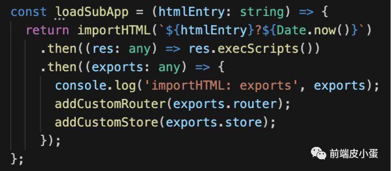 // baseexport const bootstrap = () => { // ... ReactDOM.render(( <Provider store={store}> <Router history={history}> <App defaultInitialData={_initialData} /> </Router> </Provider> ), document.getElementById('root')); return Promise.resolve();};// mainconst loadSubApp = (htmlEntry: string) => { return importHTML(`${htmlEntry}?${Date.now()}`) .then((res: any) => res.execScripts()) .then((exportedValues: any) => { console.log(`importHTML: ${htmlEntry} loaded, exports:`, exportedValues); const { store, router } = exportedValues || {} as any; router && addCustomRouter(router); store && addCustomStore(store); }) .catch(e => { console.error('importHTML: ${htmlEntry} load error:', e); });};const load = () => { if (__ENV__ !== 'dev') { const paths: string[] = []; subAppConfig.subApps.forEach(item => { if (item.project === localStorage.getItem('ops_project')) { paths.push(...item.paths); } }); Promise.all(paths.map(path => loadSubApp(path))) .catch(e => console.log(e)) .finally(setAllLoaded); } else { setAllLoaded(); }};const init = () => { console.log('init: Start to bootstrap the main APP'); addCustomStore(rootStore); bootstrap().then(() => { load(); });};init();代码共享