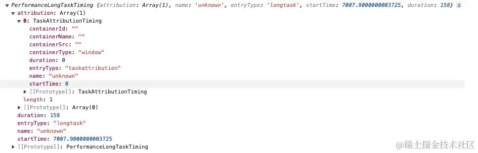 duration:表示任务的持续时间,即从开始到结束所经过的时间。TaskAttributionTiming:是与长任务(Long Task)相关的对象,用于追踪和归因长任务的执行。这个对象可能包含关于长任务的详细信息,例如任务的来源、触发事件等。通过这个对象,开发人员可以更好地了解长任务的上下文和原因,从而进行性能优化和调试。
