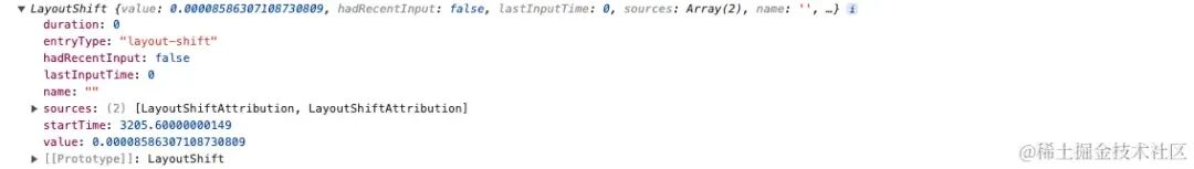value: 返回偏移分数,计算方式为:layout shift score = impact fraction * distance fraction。hadRecentInput: 如果lastInputTime过去小于 500 毫秒,则返回true。lastInputTime: 返回最近排除的用户输入的时间,如果没有则返回 0。仅考虑那些用户未期望的偏移,例如在响应用户互动时发生的离散事件,如点击链接、点击按钮或请求 API 时显示加载等。这些情况被视为合理的偏移。