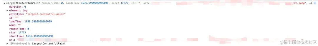 element: 当前最大的内容绘制元素loadingTime: 加载时间renderTime: 渲染时间。如果是跨域请求,则为 0。size: 元素本身的面积startTime: 如果renderTime不为 0,则返回renderTime;否则返回loadingTime